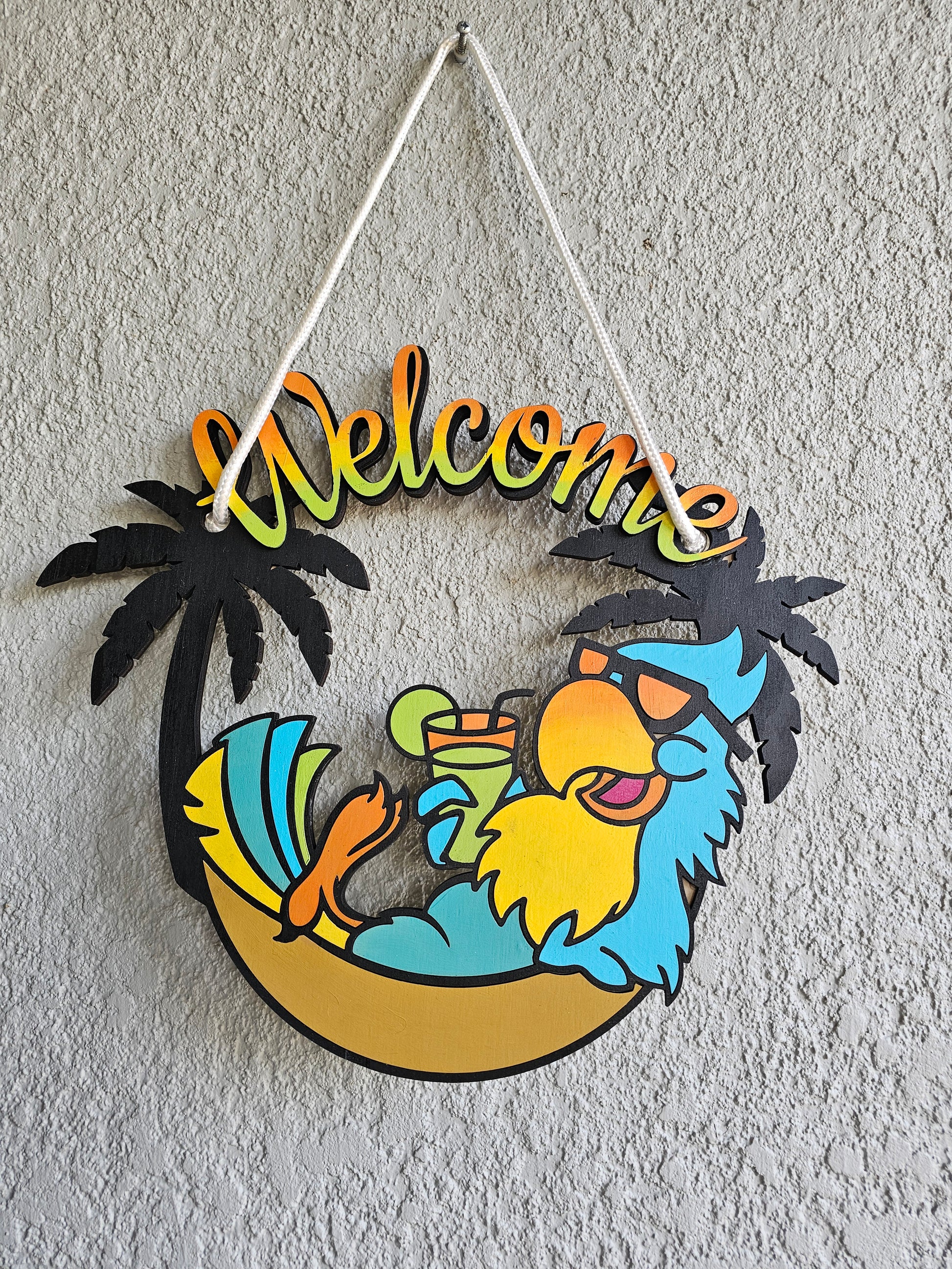 Multi layered laser cut door hanger that is a 10 inch round sign. It is hand painted with exterior paint. It is designed to be used on a front door that is under a covered roof.