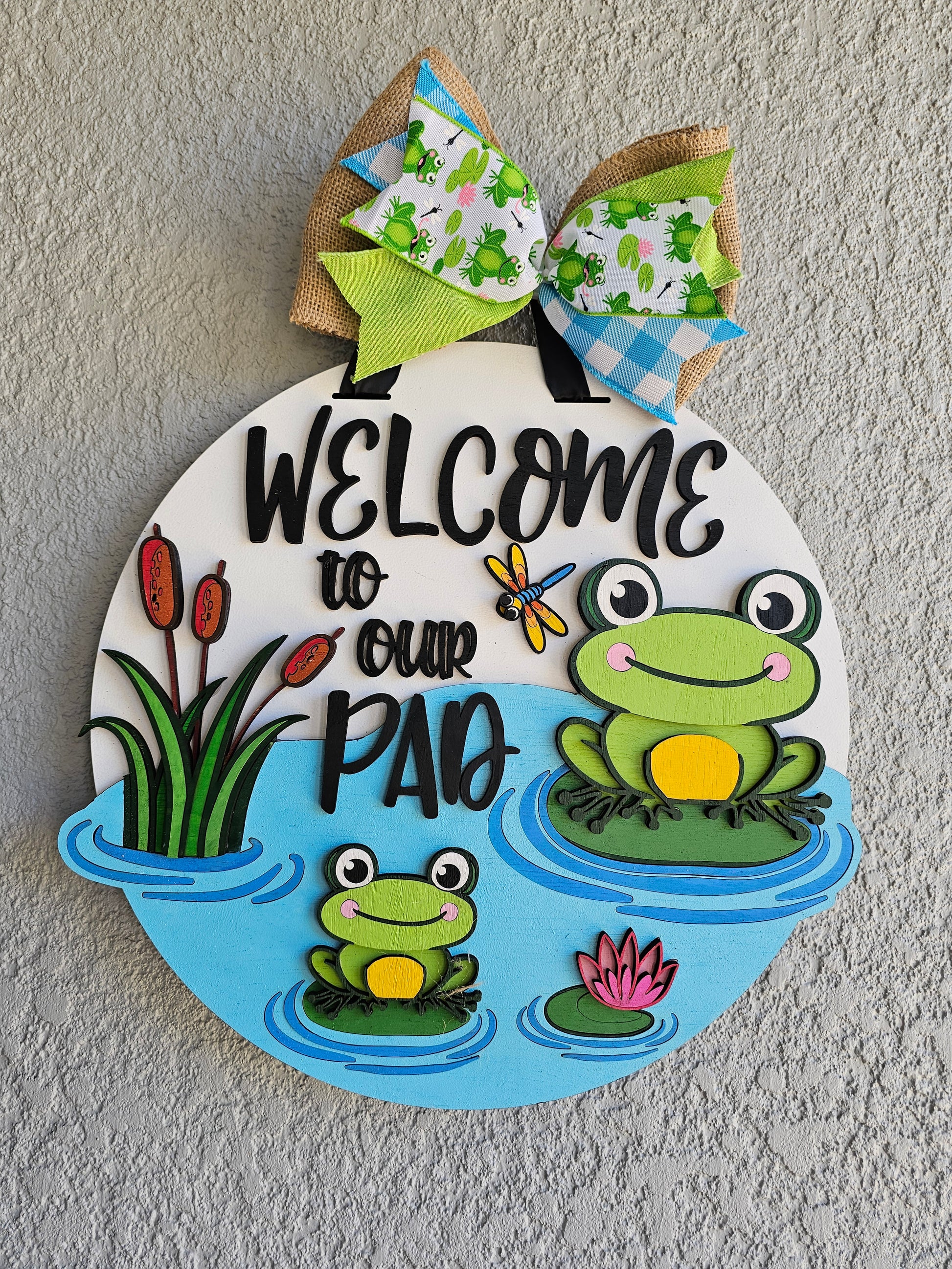 Multi layered laser cut door hanger that is a 15 inch round sign. It is hand painted with exterior paint. It is designed to be used on a front door that is under a covered roof.